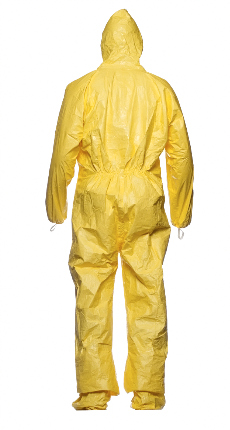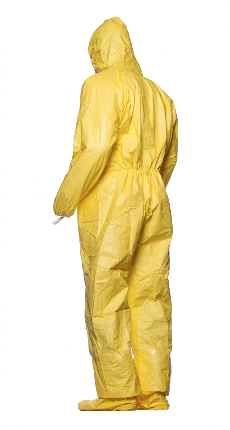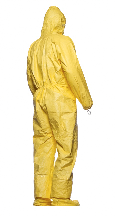DuPont™ Tychem® 2000 C Gown model PL50. Shin-length. Wrap-over rear closure with tie. Stitched and over-taped seams. Yellow.