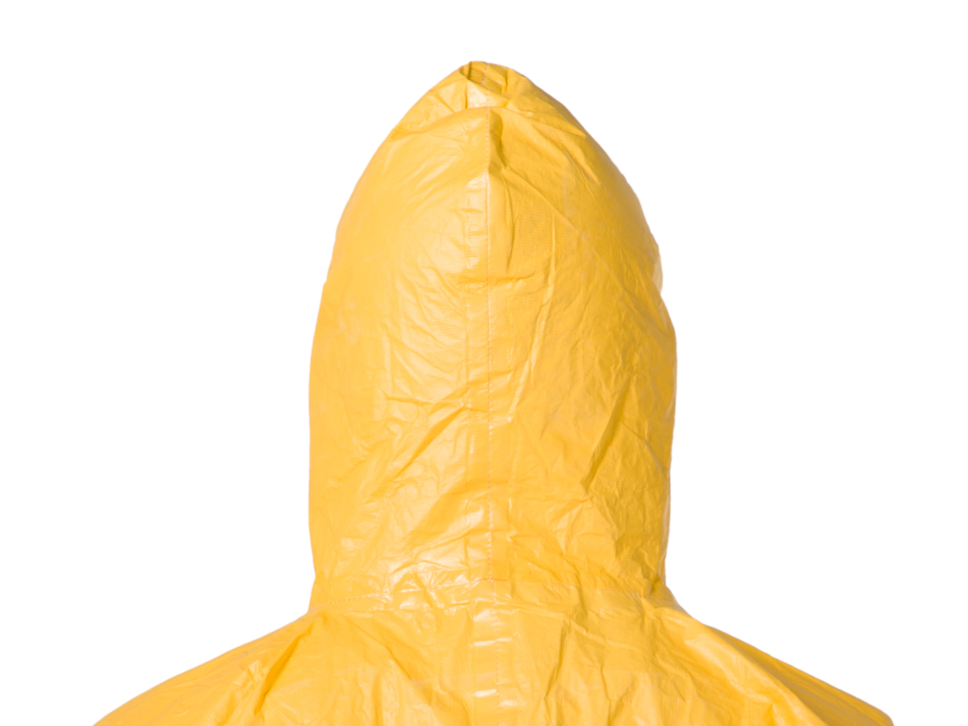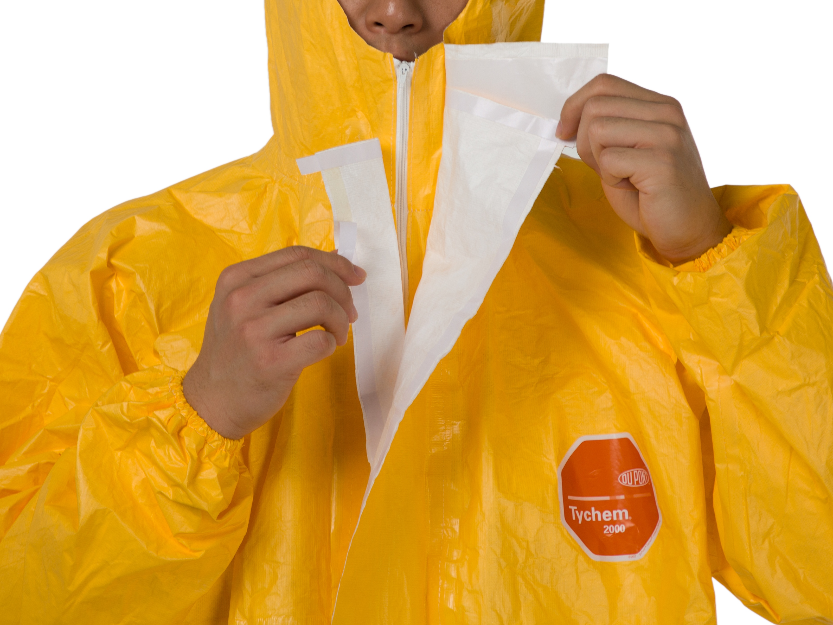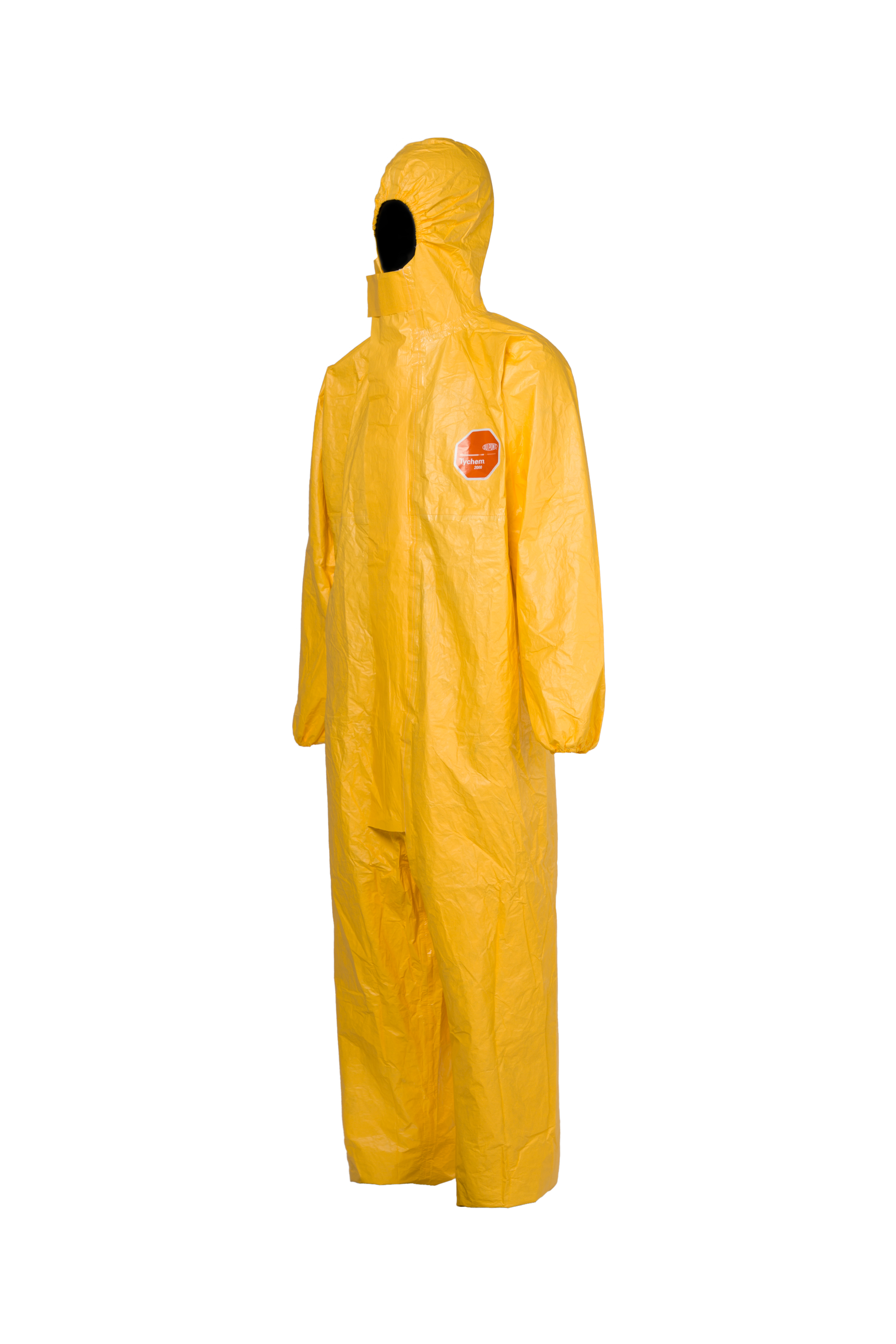 DuPont™ Tychem® 2000, model TC198T YL. Hooded coverall. Available in bright yellow for high visibility and in sizes SM-3XL. Stitched and over-taped seams. Elasticated face, wrists, waist and ankles for an optimal fit. Self-adhesive chin flap for tight seal of suit to face-masks.