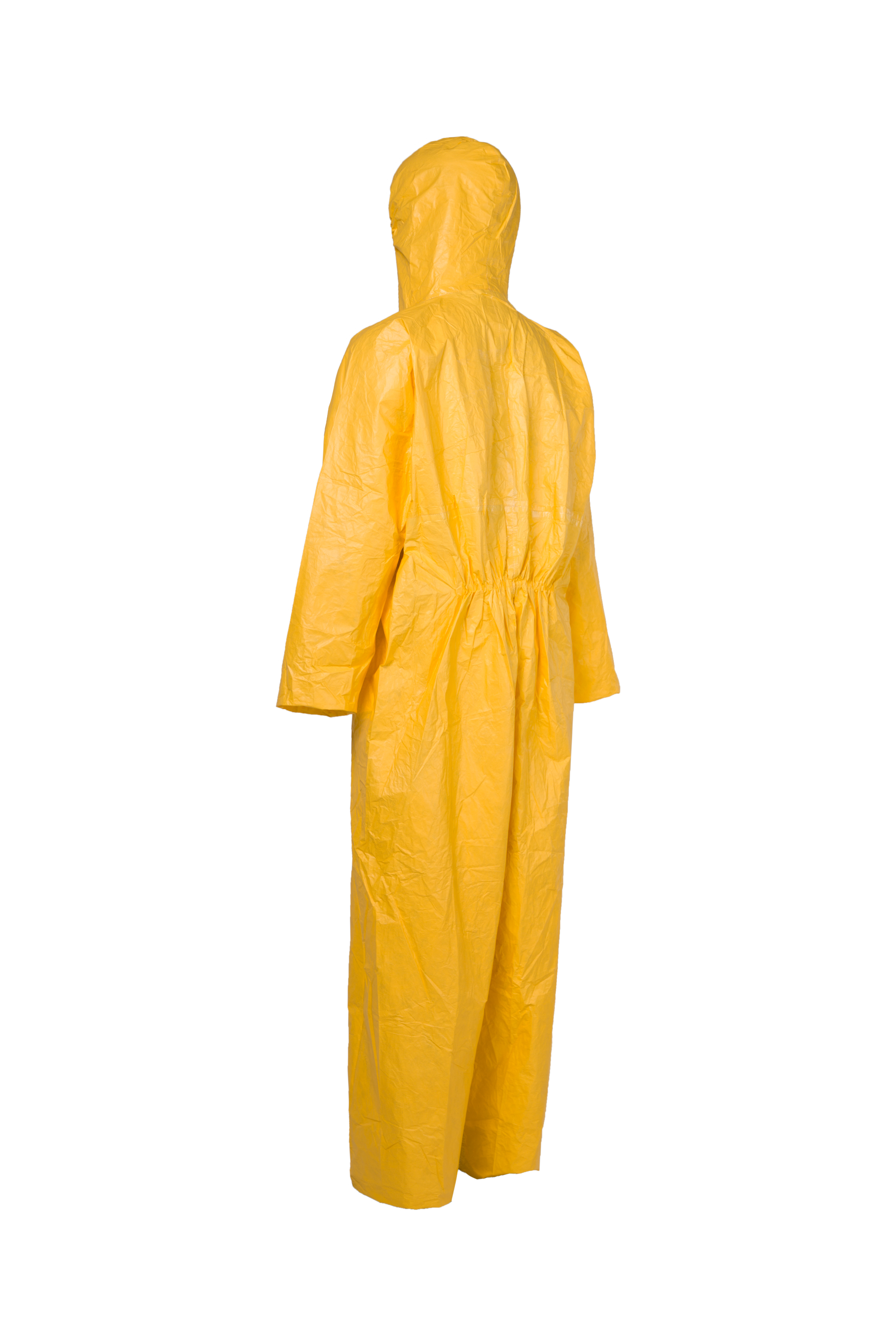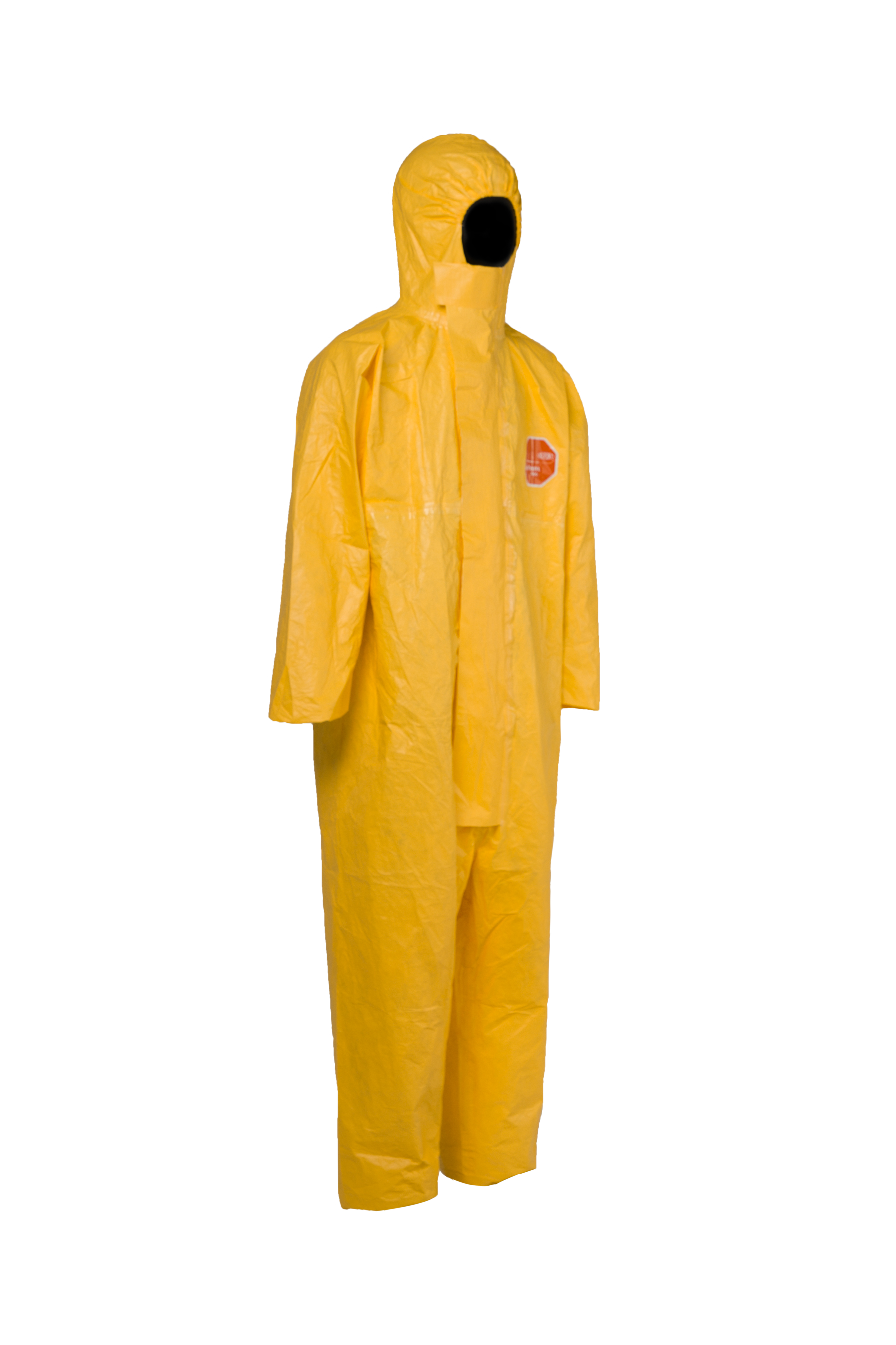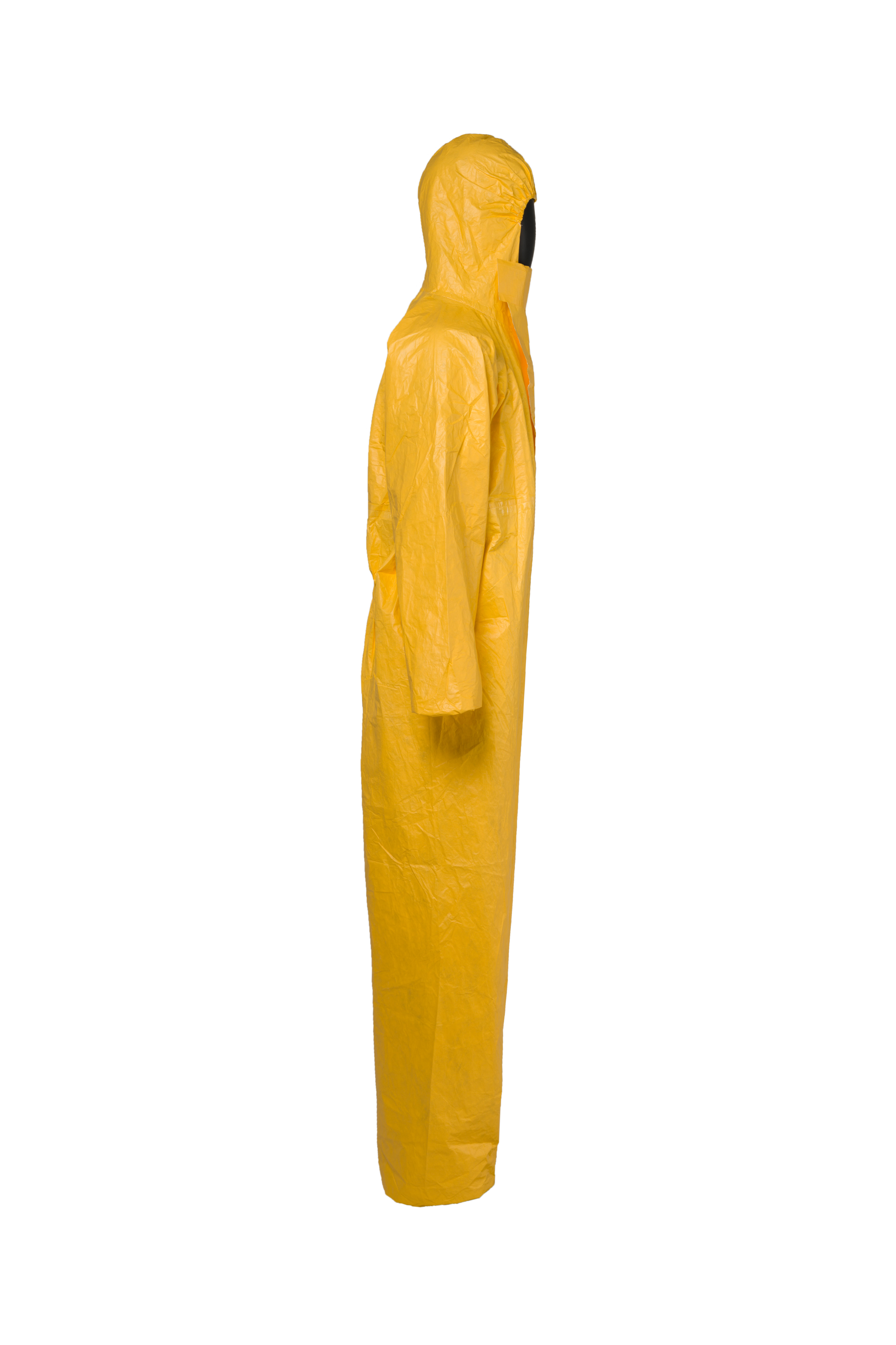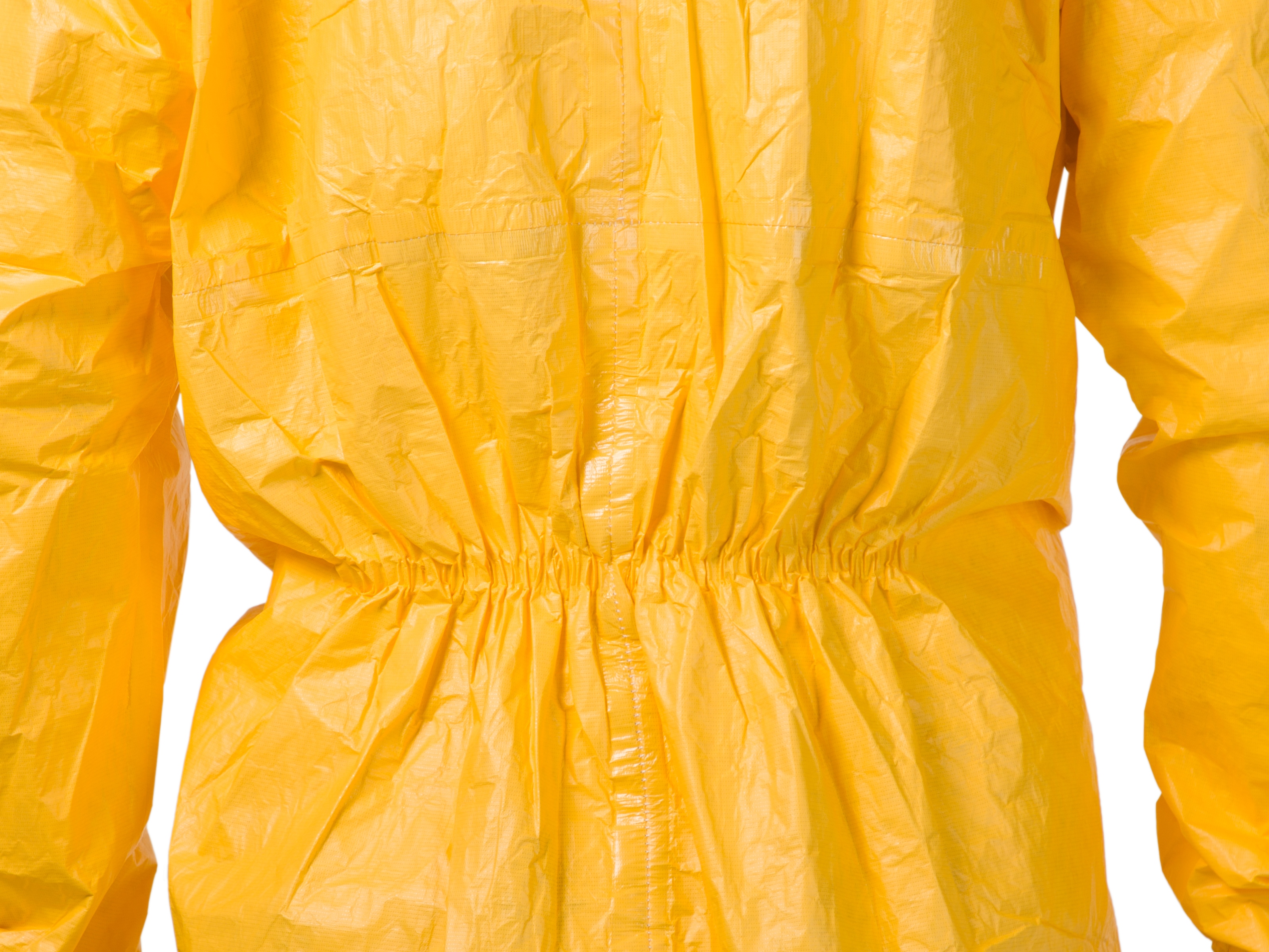DuPont™ Tychem® 2000, model TC198T YL. Hooded coverall. Available in bright yellow for high visibility and in sizes SM-3XL. Stitched and over-taped seams. Elasticated face, wrists, waist and ankles for an optimal fit. Self-adhesive chin flap for tight seal of suit to face-masks.
