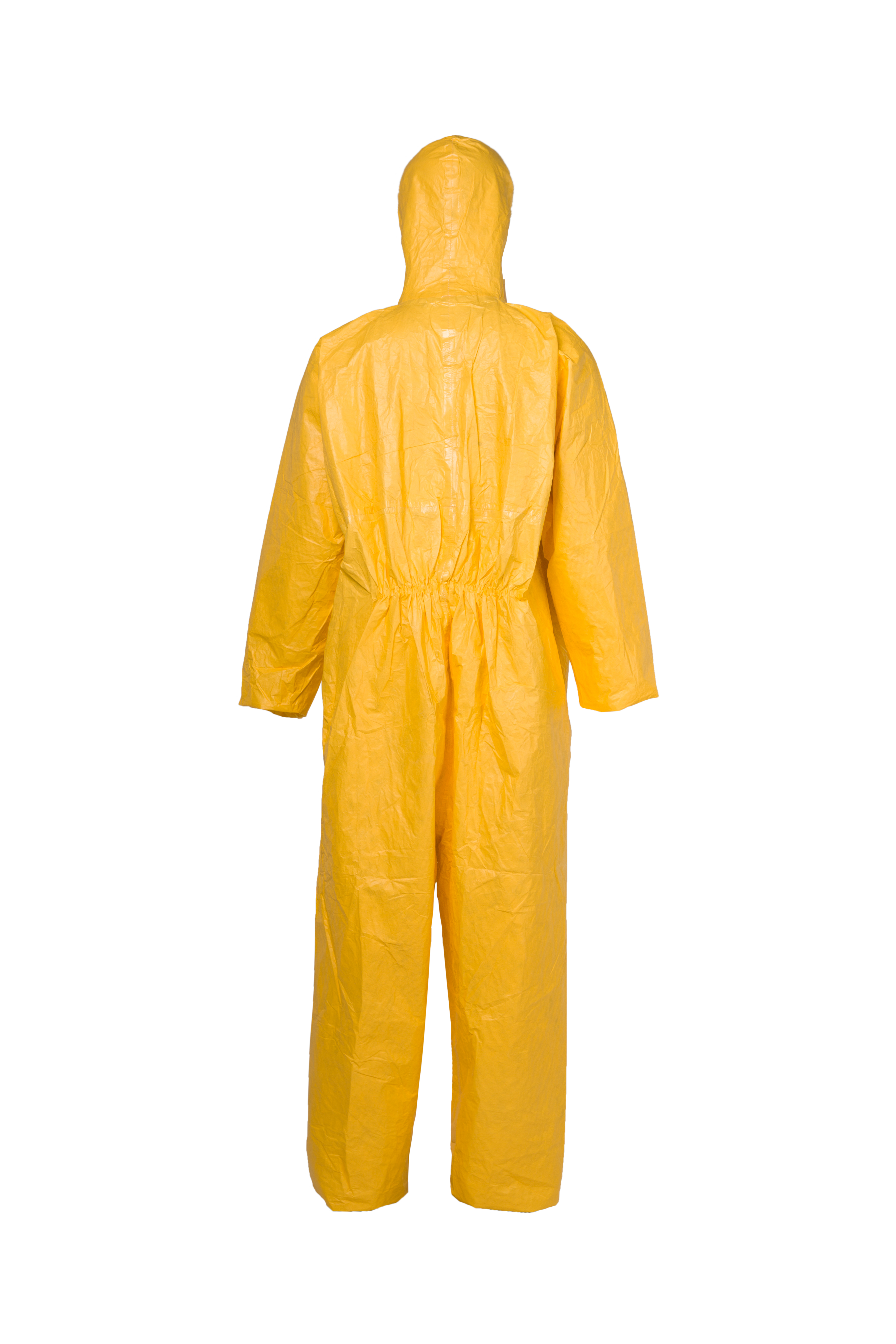 DuPont™ Tychem® 2000 C Gown model PL50. Shin-length. Wrap-over rear closure with tie. Stitched and over-taped seams. Yellow.