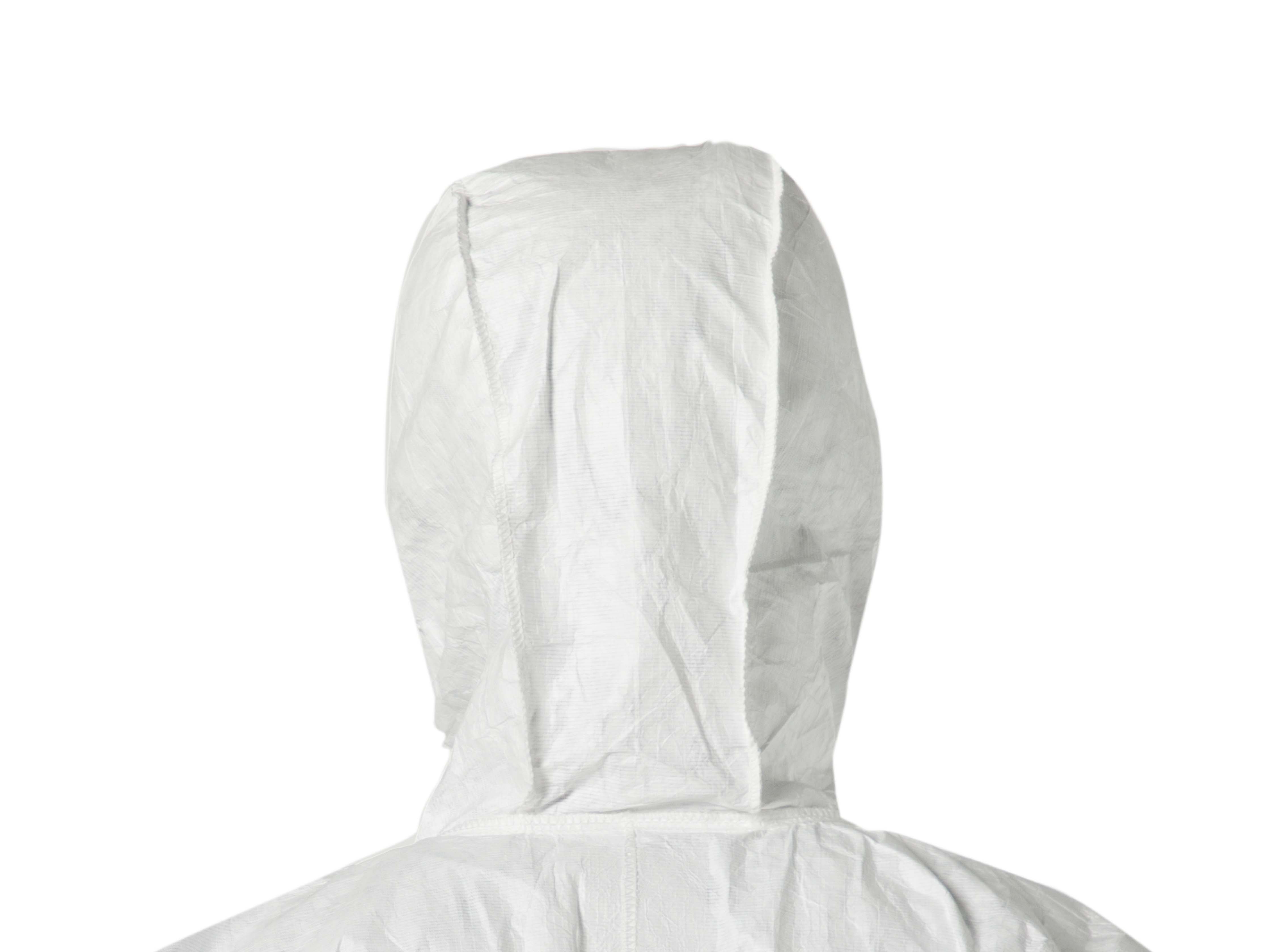 DuPont™ Tyvek® 400, model TY658S WH. Hood. Wide flange and elastic around face and neck. Stitched internal seams. White.