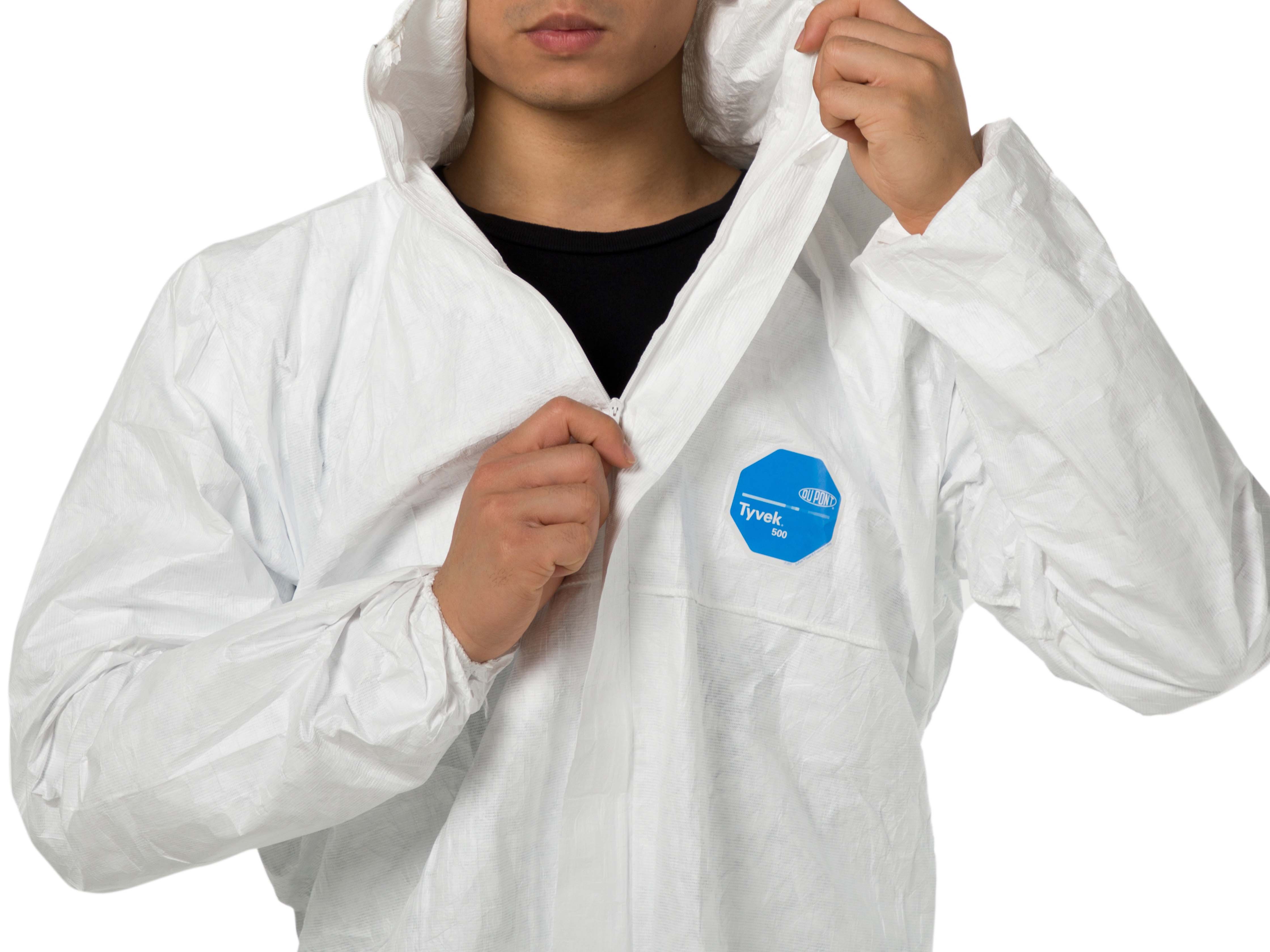 DuPont™ Tyvek® 500 Xpert/DuPont™ Tyvek® 500 Xpert (Ecopack). Hooded coverall available in white, in sizes SM to 3X (blue and green garments also available). Robust yet lightweight (<180g per garment). 3-piece hood for optimal fit to head and face when turning. Elasticated face, wrists and ankles as well as glued-in waist elastic. Ample crotch area for freedom of movement. Large, easy-to-grasp zipper puller.