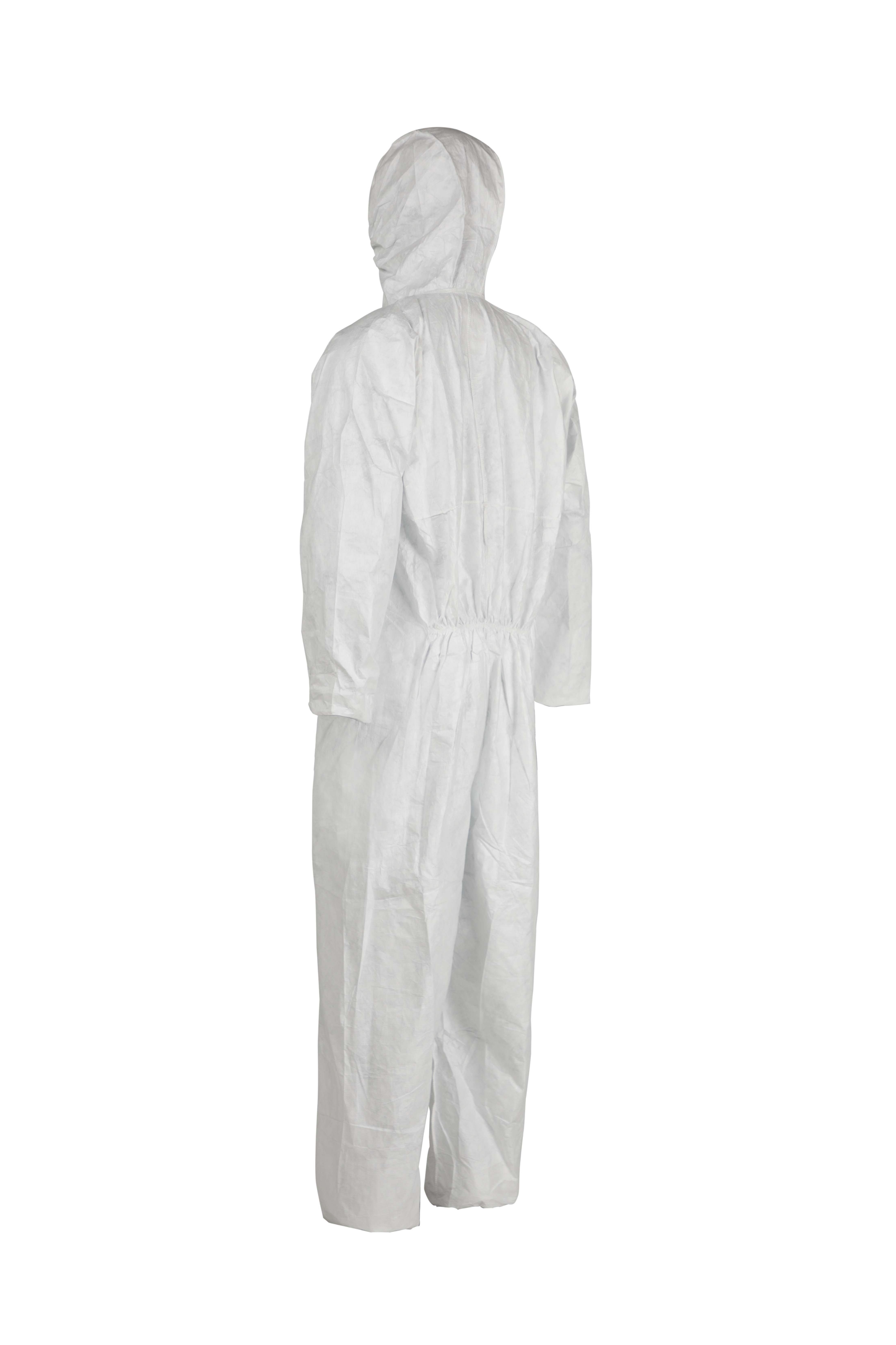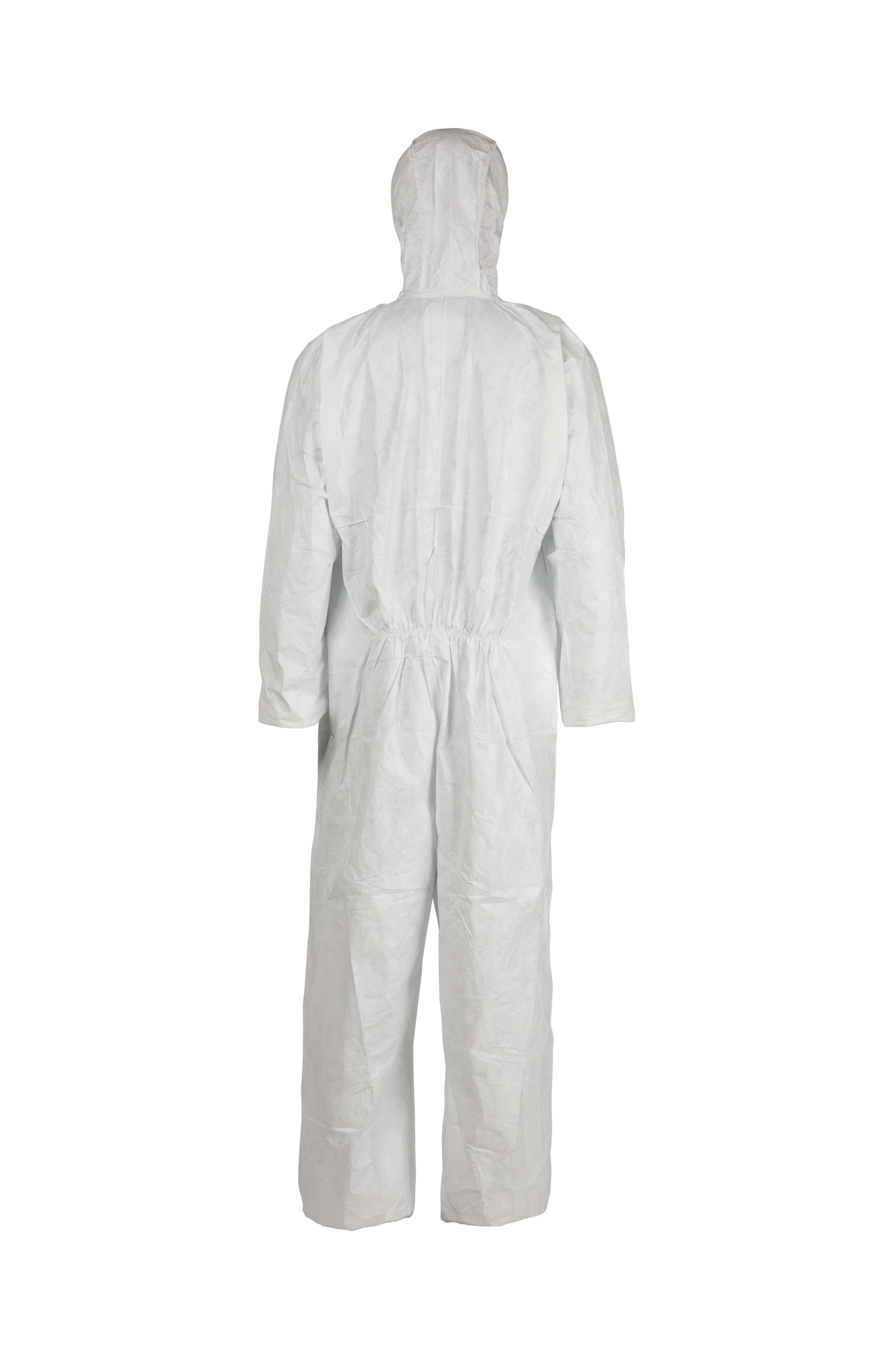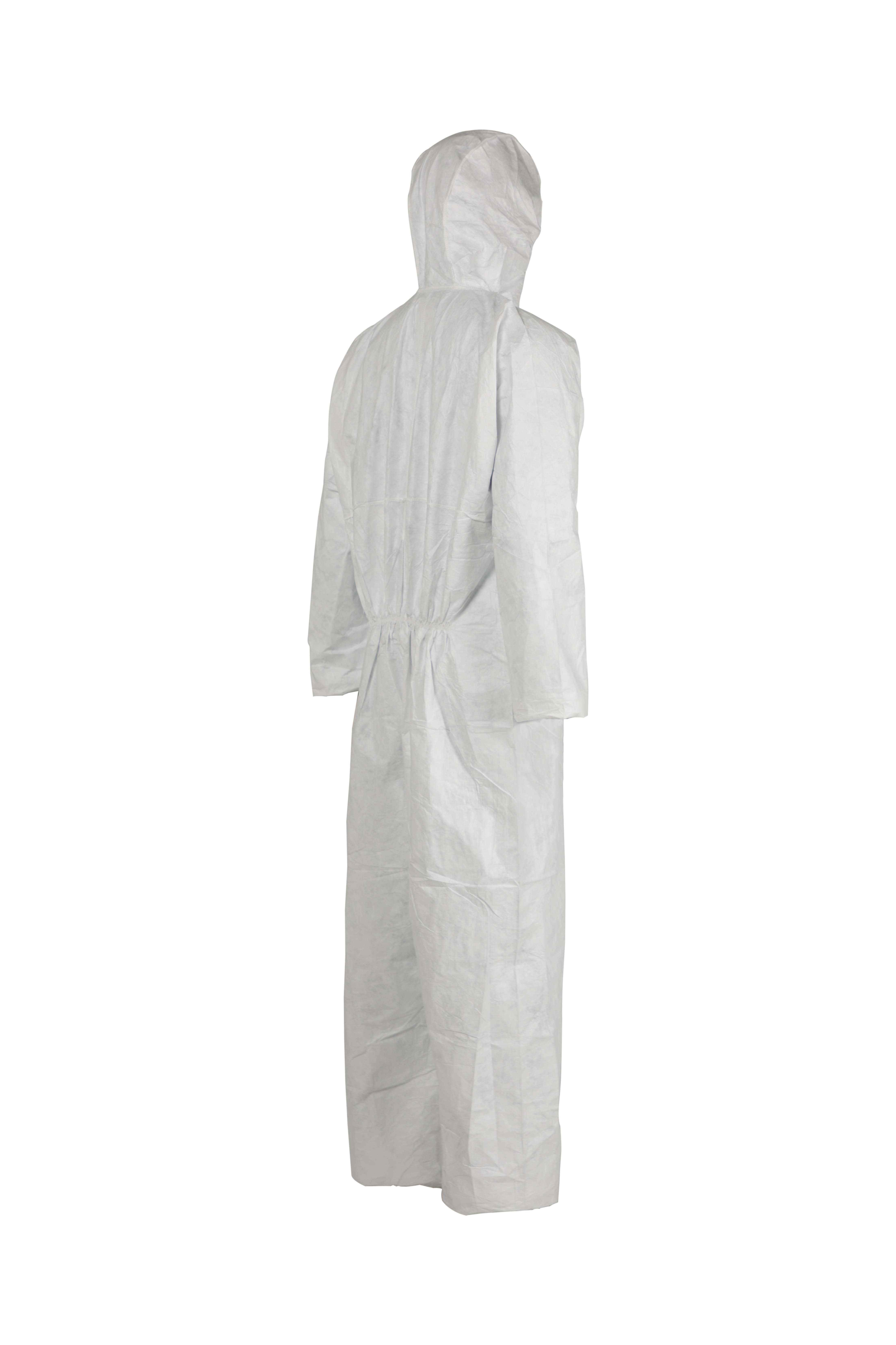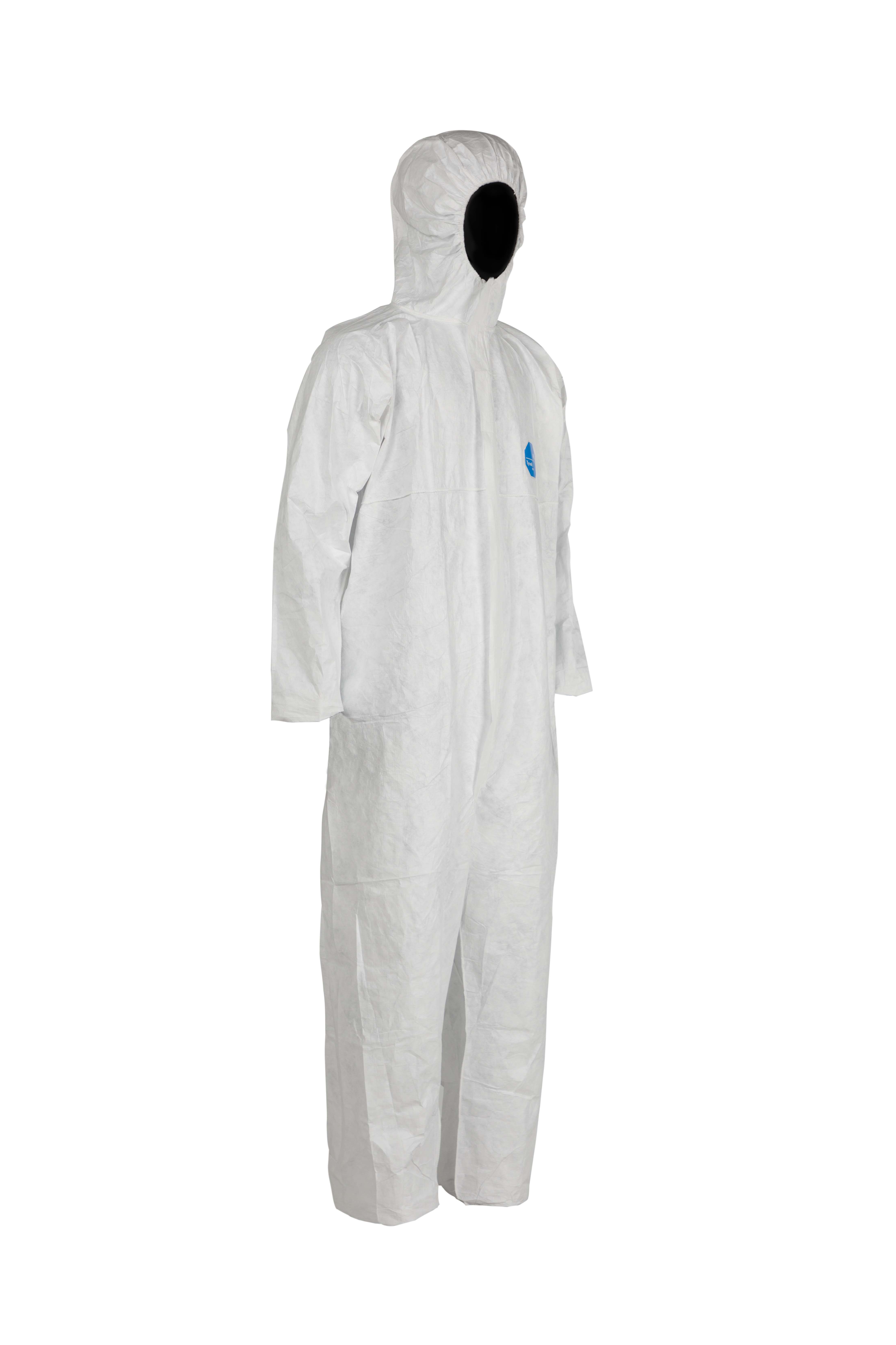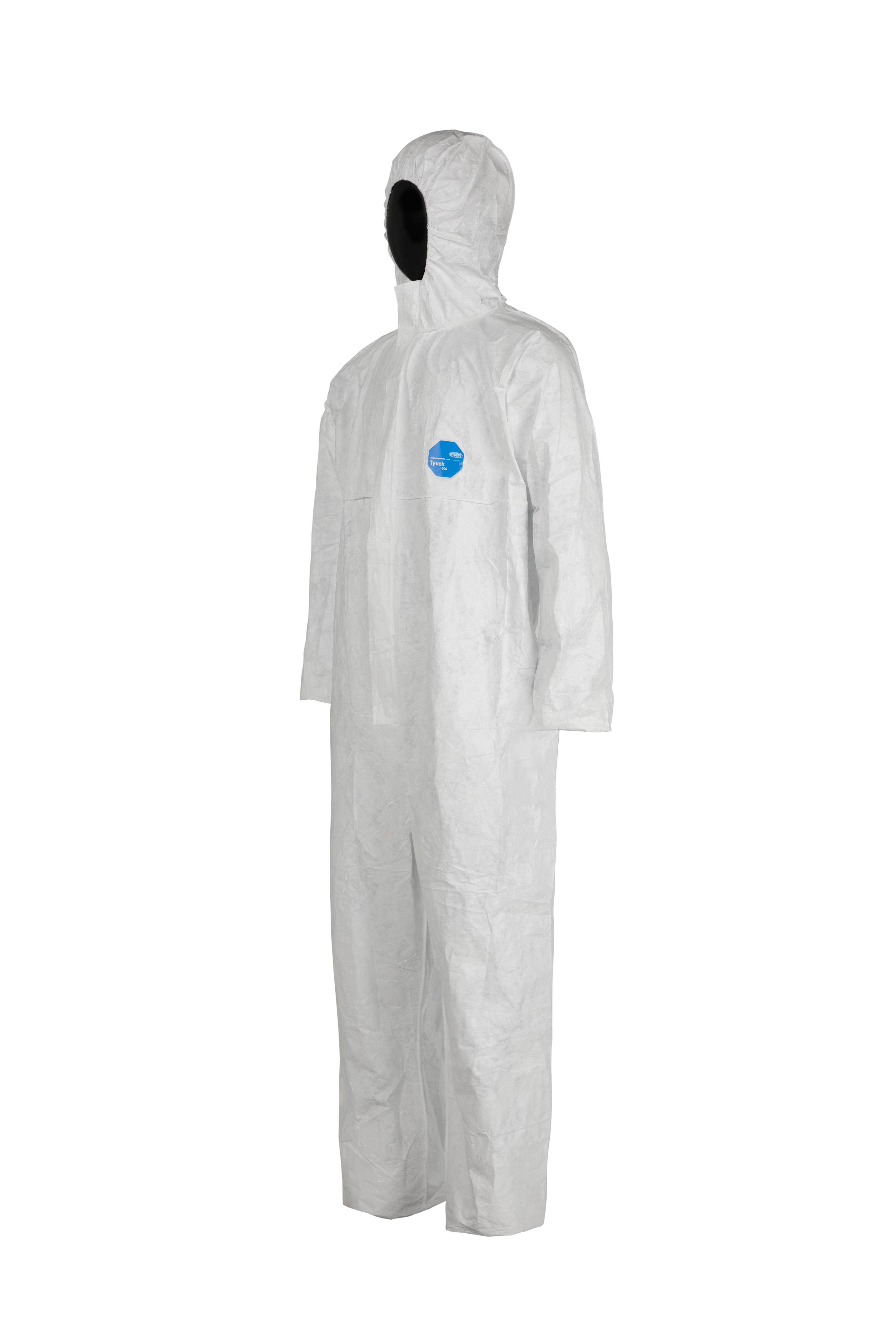 DuPont™ Tyvek® 600 Plus. Hooded coverall. Stitched and over-taped seams. Thumb loops. Tunnelled elastication at wrists, ankles and face. Elasticated waist (glued-in). Tyvek® zipper. Self-adhesive zipper and chin flap. White.