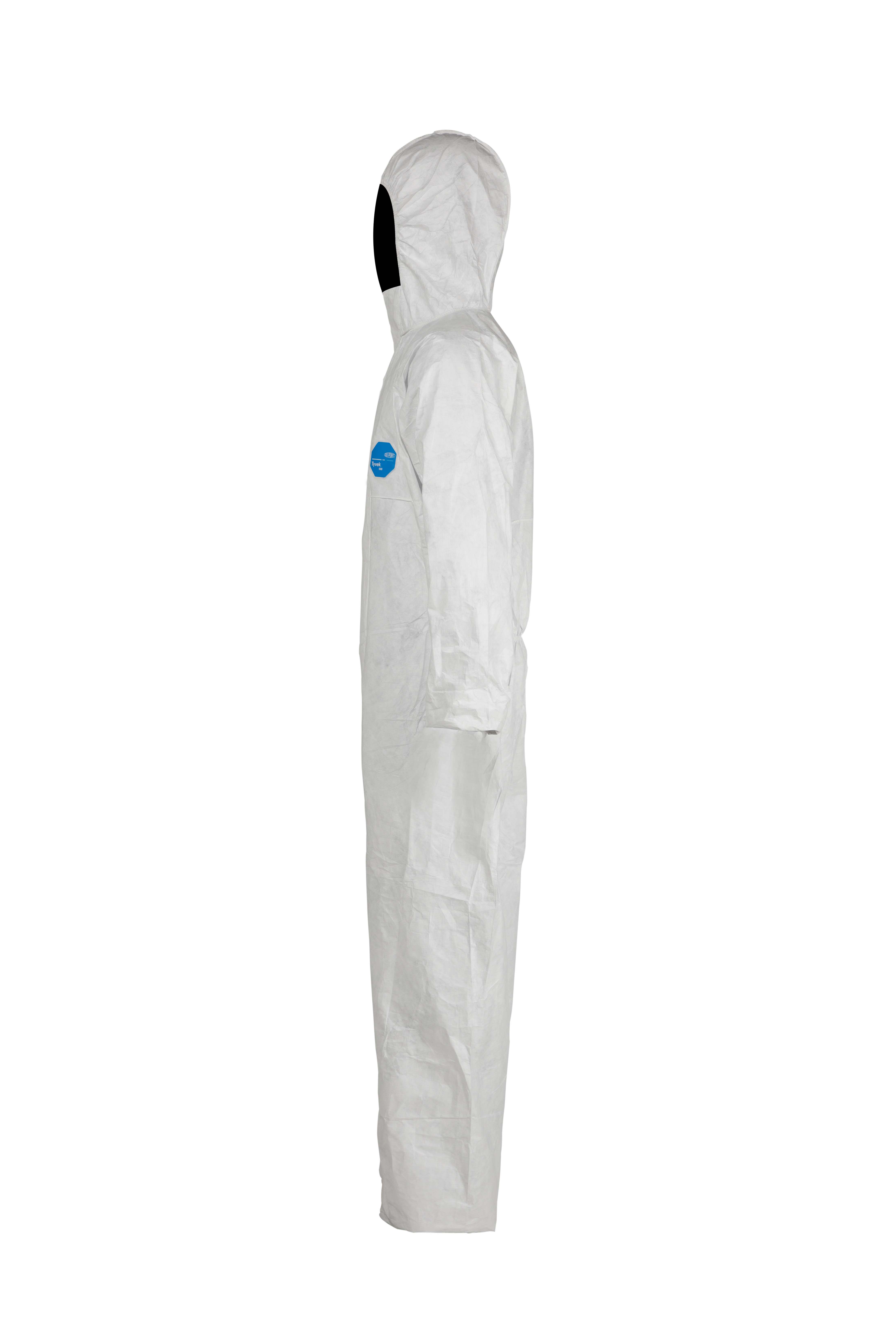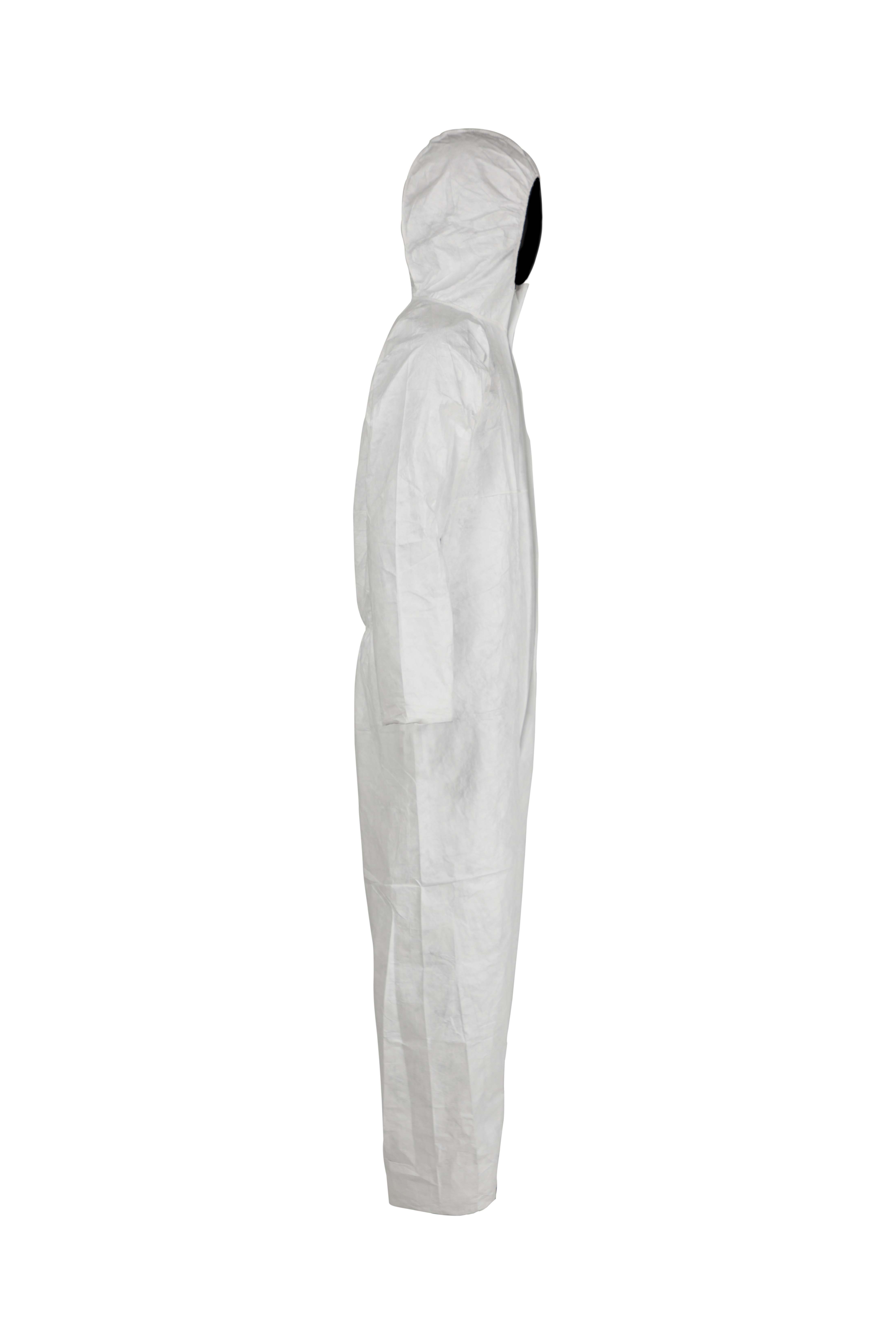 DuPont Tyvek® 600 Plus. Hooded coverall. Stitched and over-taped seams. Thumb loops. Tunnelled elastication at wrists, ankles and face. Elasticated waist (glued-in). Tyvek® zipper. Self-adhesive zipper and chin flap. White.